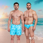 2 piezas de traje de baño para hombre de marca Equal Swimwear Short Brief, con mismo diseño POLÍGONOS AZUL que te va a encantar