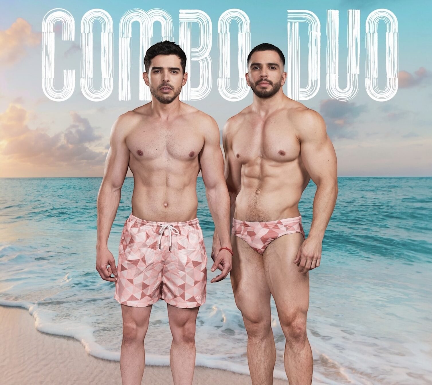 2 piezas de traje de baño para hombre de marca Equal Swimwear Short Brief, con mismo diseño tipo POLÍGONOS ROSA que te va a encantar